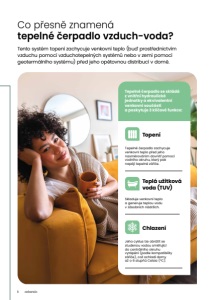 Co přesně znamená tepelné čerpadlo vzduch-voda? Tento systém topení zachycuje venkovní teplo (buď prostřednictvím vzduchu pomocí vzduchotepelných systémů nebo v zemi pomocí geotermálního systému) před jeho opětovnou distribucí v domě. Tepelné čerpadlo zachycuje venkovní teplo před jeho nasměrováním dovnitř pomocí vodního okruhu, který pak napájí tepelné zářiče. Skladuje venkovní teplo a generuje teplou vodu v zásobních nádržích. Jeho cyklus lze obrátit se studenou vodou směřující do centrálního okruhu vytápění (podle kompatibility zářiče), což ochladí domy až o 6 stupňů Celsia (°C). Teplá užitková voda (TUV) Topení Chlazení Tepelné čerpadlo se skládá z vnitřní hydraulické jednotky a ekvivalentní venkovní součásti a poskytuje 3 klíčové funkce: 1